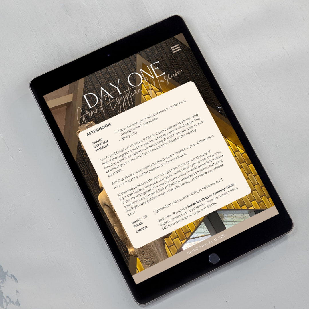 Discover Cairo like never before with this comprehensive 5-day travel guide. Explore the iconic Pyramids and ancient wonders of Saqqara, immerse yourself in the spiritual heritage of Coptic Cairo, and marvel at treasures housed in the Grand Egyptian Museum. This expertly curated itinerary also includes an unforgettable day trip to Alexandria, where you'll descend into mysterious catacombs, stand before the towering Pompeo's Pillar, and stroll along the breathtaking Corniche. Perfect for history enthusiasts and adventurous travellers seeking authentic Egyptian experiences, this guide transforms your Cairo visit into an extraordinary journey through millennia of civilisation.